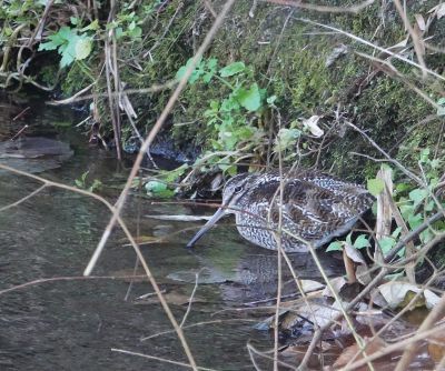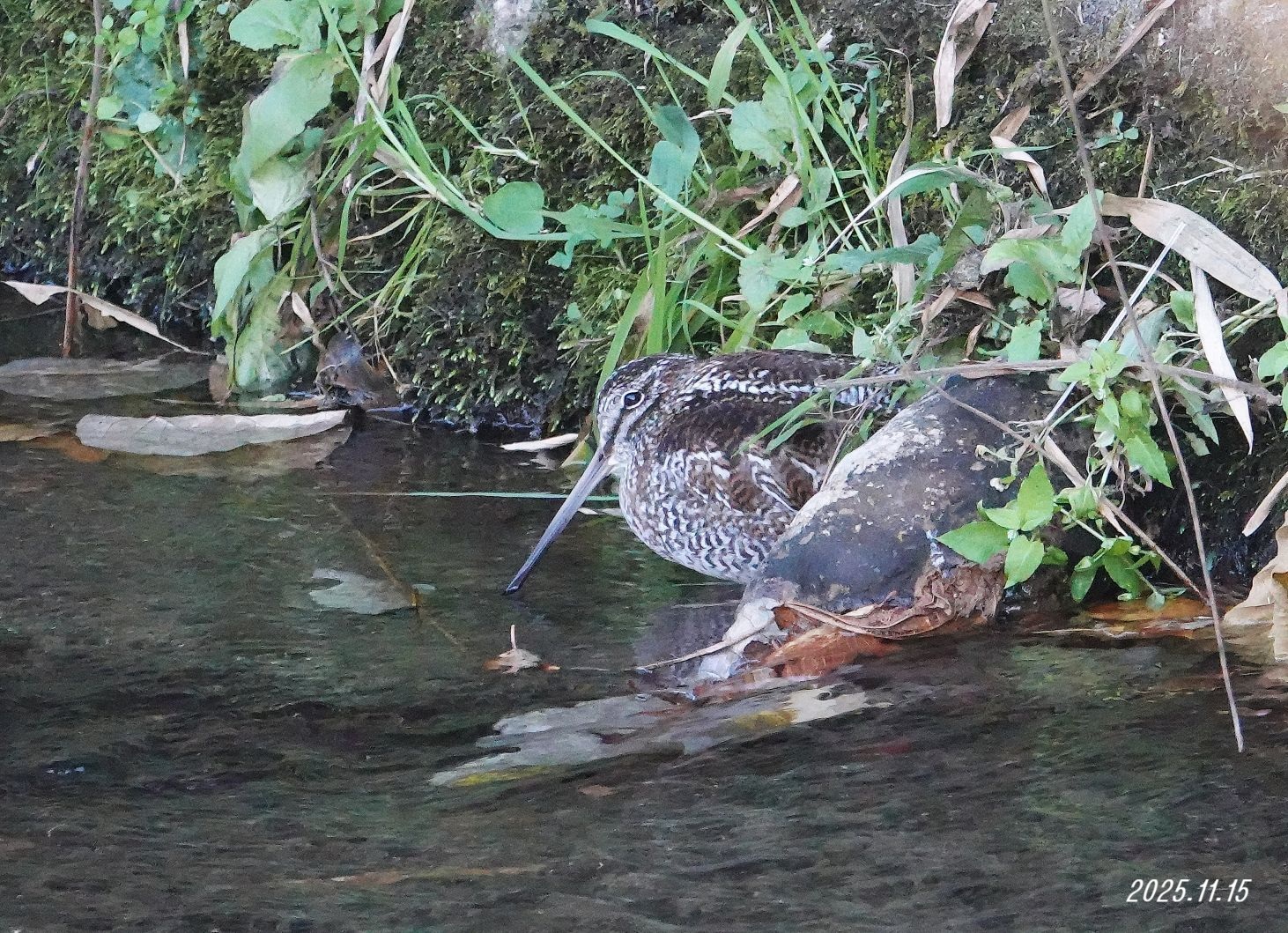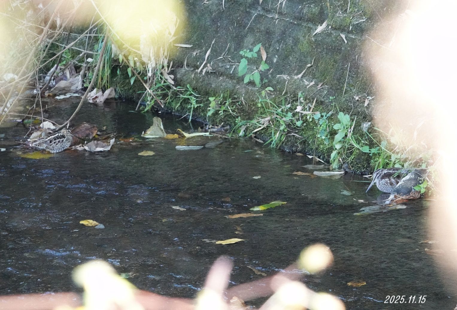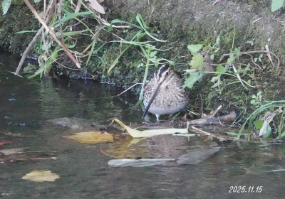 標高が低い三面壁は時々タシギにも出会えます。冬季の関東ジシギ2種が1画面に入ってくれました。川底がコンクリートで生き物の種類は少ないと思いますが、落ち葉の中のカガンボやカゲロウの幼虫を捉えていると思います。