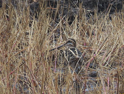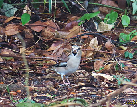 雨はすぐにやみ全員で数羽のタシギを観察、他にも多くの鳥たちに会う事ができ、最後は地面で採餌中のシメに会って終了となりました。(記 山崎)