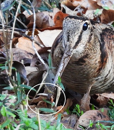 土中での獲物は目では探せないので盛んに嘴を差し込んで、その感触で咥えているようです。主にミミズですが、今日は落ち葉の中から蛾と思われる幼虫も咥えていました。ゴミムシの幼虫のようです。